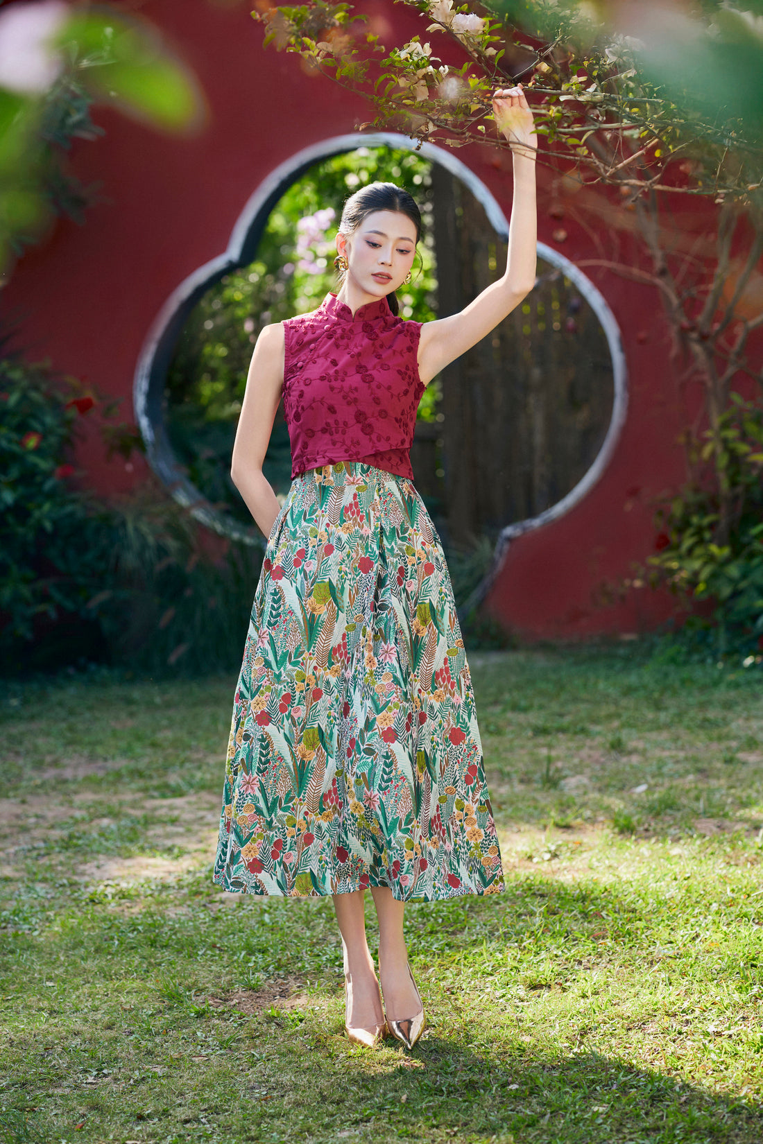 - Made with cotton (top) and jacquard (skirt).